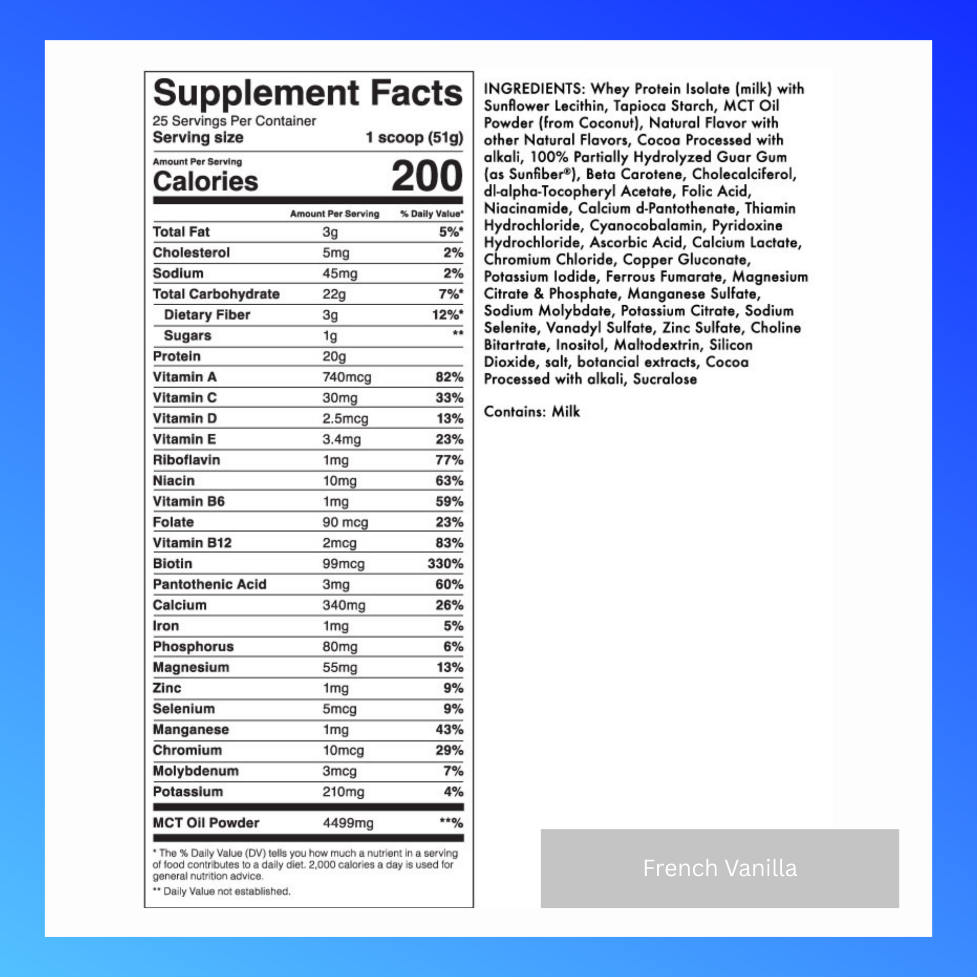 Key ingredients include whey protein isolate, MCT oil powder derived from coconut, partially hydrolyzed guar gum for digestion and satiety, tapioca starch, and sunflower lecithin—all blended with natural and botanical flavors for a smooth, satisfying taste.